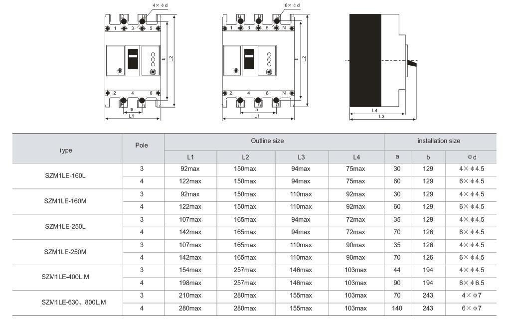 SZM1LE series residual current circuit breaker(hereinafter referred to as circuit breaker) is suitablefor distributing network ofAC50Hz,ratedvoltage400V,ratedcurrent 800A, to make indirect contactprotection to the human being, also to prevent fireaccident caused by ground fault current due to thedamage of insulation of equipment. In addition, it notonly can be used to distribute electric energy and protect the circuit and power equipment against overload and short circuit, but also can be used to switch the circuit or start the motor infrequently. The sampling operational power supply of leakage protec-tion module of common residual current circuitbreakers is two phases, but this series of circuitbreakers is three phases, and if any one of threephases is lack, this circuit breaker leakage protectionmodule can still work normally. The rated residualoperation current and max breaking time may beadjusted according to practical situations.