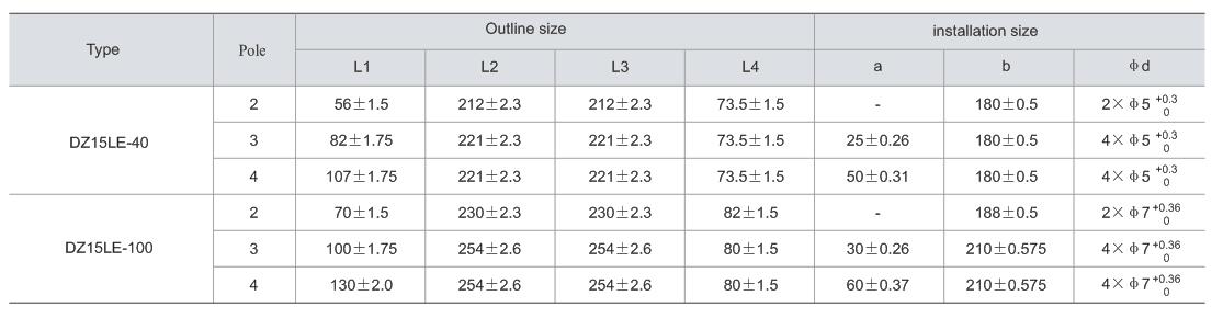 DZ15LE series leakage circuit breaker is suitable forcircuit of AC 50Hz, rated working voltage 380V andrated current 100A, to make indirect contact protection to the human being, also to prevent fire accident causedby ground fault current due to the damage of insulationof equipment. In addition, it not only can protectthe circuit and motor against overload and short circuit,but also can be used to switch the circuit and startthe motor infrequently.