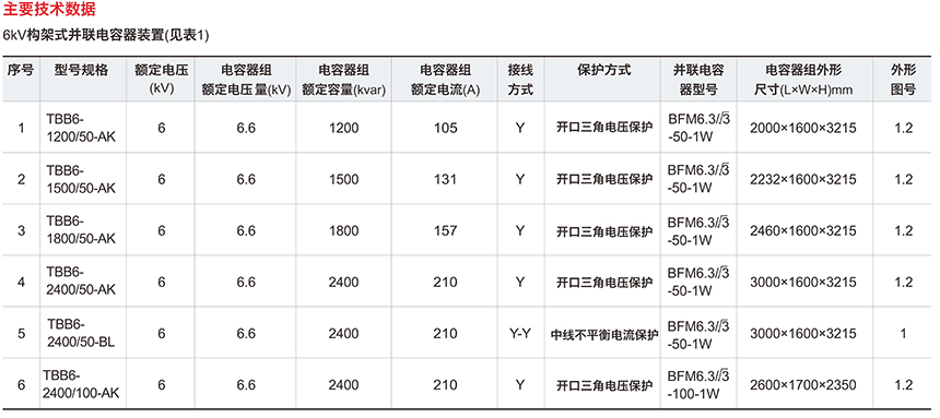 電容器組按不同容量規(guī)格,由一臺(tái)進(jìn)線柜和一至數(shù)臺(tái)電容器柜組合而成。進(jìn)線柜裝設(shè)放電線圈、接地開(kāi)關(guān)氧化鋅避雷器。電容器柜內(nèi)包括并聯(lián)電容器、單臺(tái)電容器保護(hù)用熔斷器。