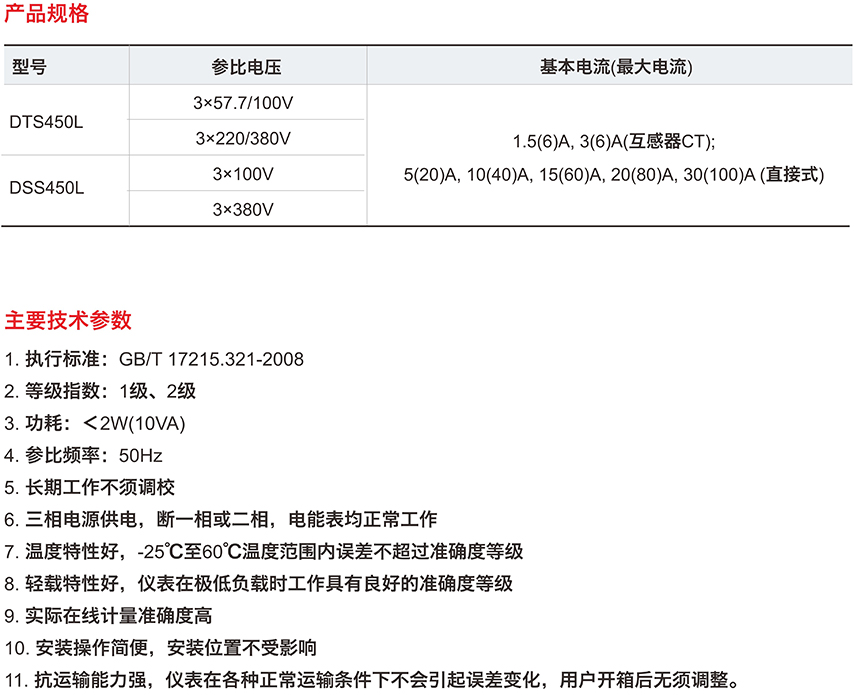 DTS450、DSS450系列三相電子式電能表用于測量三相四線,三相三線電能,它采用高精度寬量程數(shù)字化電能計量芯片,設(shè)計結(jié)構(gòu)合理,具有性能穩(wěn)定,可靠性高,低功耗,電能表具有使用壽命長,免維護(hù)。提供脈沖輸出,方便用戶檢測