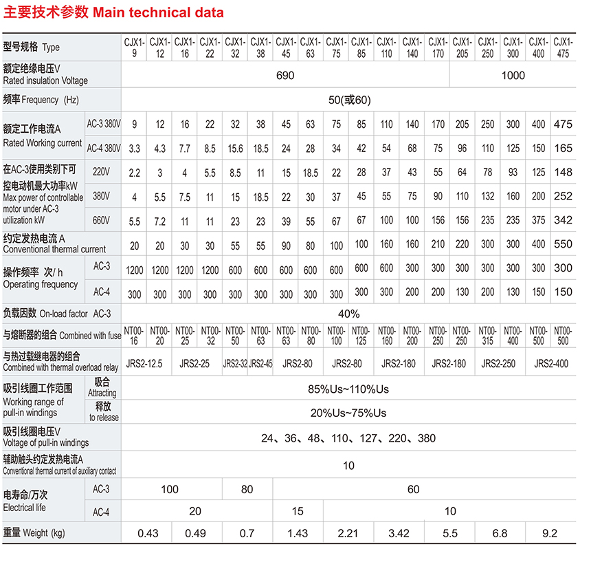 ? ? ? CJX1系列交流接觸器主要用于交流50Hz(或60Hz)、額定工作電壓至1000V,在AC-3使用類別下額定工作電壓為380V時額定工作電流