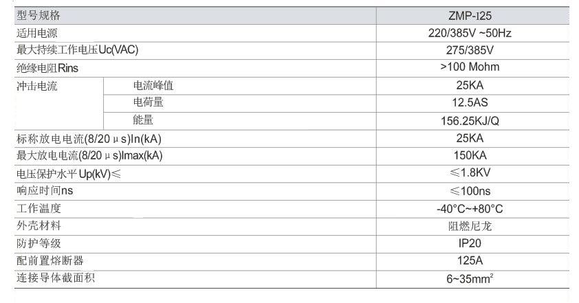 ZMP-I25系列限壓型電涌保護器(屬于一級防雷器,10/350μs波形)依據(jù)IEC和GB標準設計。應用于雷擊風險較高地區(qū)的設備系統(tǒng)的電源第一級電涌保護。可防范直擊雷在內的各種電涌電流,通過不同數(shù)量的組合可適用于單相、三相供電線路,模塊化設計,標準35mm導軌式安裝方式,安裝于建筑物總配電柜(箱)、室外配電柜(箱),具備很高的雷電流泄放能力,無續(xù)流,單模塊最大沖擊電流(10/35μs)分別可達Iimp=15kA,Iimp=25kA, Iimp=35kA, Iimp=50kA最大放電電流(8/20μs)可分別達到Imax=100kA, Imax=150kA, Imax=160kA, Imax=200kA